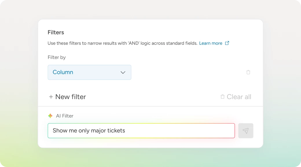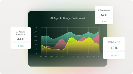 Get a clear view of how AI agents perform across your organization, with key metrics around execution trends and top-performing agents across channels. Identify which AI agents are used most and by whom, helping you understand your organization’s top needs and adoption trends.