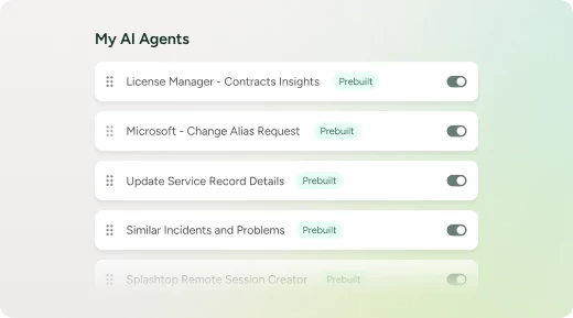 Work smarter and faster with prebuilt AI agents designed to handle common IT and service activities on your behalf. New AI agents are added regularly, and now ready to use in your Agent Chatbot, with the latest including:
